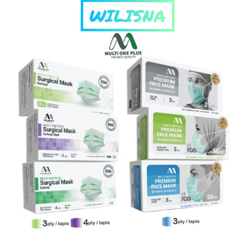 Masker Medis Premium/Surgical Multi One Plus (3 Ply/4 Ply) (Earloop/Hijab/Tie On)